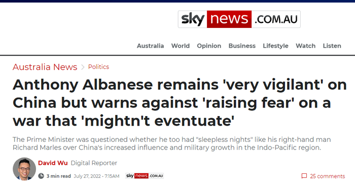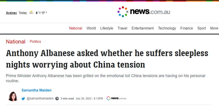 阿尔巴内塞对此回答,“人们会用他们自己的定义(来回答这个问题)。他(指中国)是值得关注并且也令我们警惕的问题”。他介绍说,澳政府因此定期举行国家安全委员会会议,他自己今年也参加了在西班牙举行的北约峰会,以及在日本举行的四国机制峰会等。