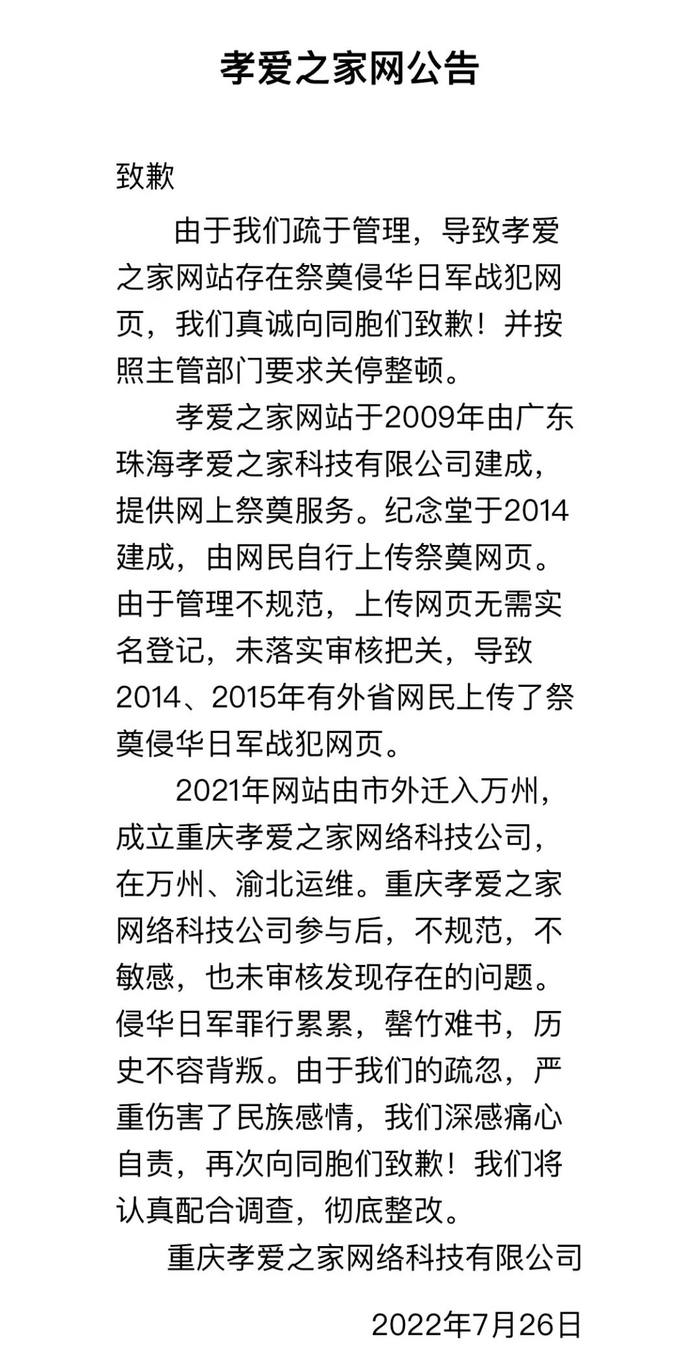 同日,重庆孝爱之家网络科技有限公司发布《孝爱之家网公告》称,由于疏于管理,导致网站存在祭奠侵华日军战犯网页。