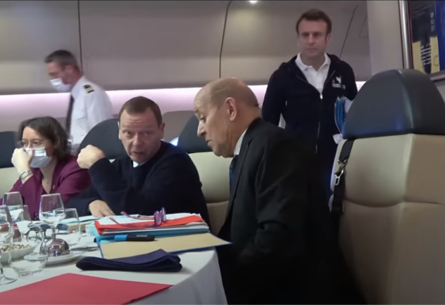 马克龙在总统专机上召开会议,博纳等外交顾问参加,而外长勒德里昂虽然在场,却没有发言“戏份”。
