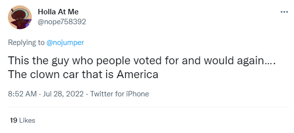 但更多人只是抱着看乐子的心态,讽刺美国政客“像个小丑”。“人们一再投票的对象,竟然是这种家伙。。。一群小丑。”
