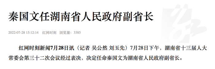 7月28日下午,湖南省十三届人大常委会第三十二次会议经过表决,决定任命秦国文为湖南省人民政府副省长。