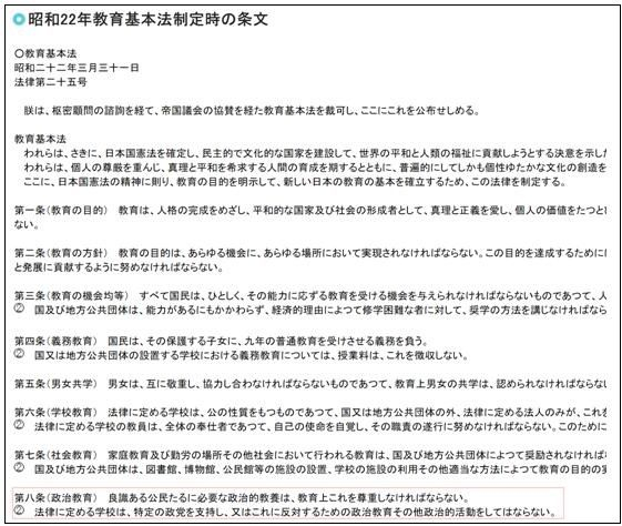 1947年,也就是昭和22年,日本刚结束二战之时,颁布的教育基本法就规定学校教育禁止支持或者反对特定的政党,以及其他的政治活动。 这一条似乎是为了反思二战的问题,但最终让学校完全回避了政治教育话题。