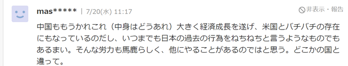 “中国经济发展成果这么显著,都能跟美国对着干了。也就别一直纠结日本当年的行为了吧。别浪费时间,做些正事去呗,别和某些国家一样。(这里应该指的是韩国)”