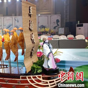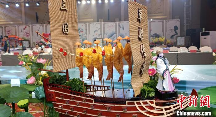 现场,各参展单位各显其能,创新菜品争奇斗艳。其中,一道名为“草船借箭”的菜品,最为抢眼。只见菜盘是一艘木制的小船,“诸葛亮”气定神闲地站立船头,桅杆间用新鲜大虾做的一个个金黄色“稻草人”,再现了三国时期诸葛亮草船借箭的故事。