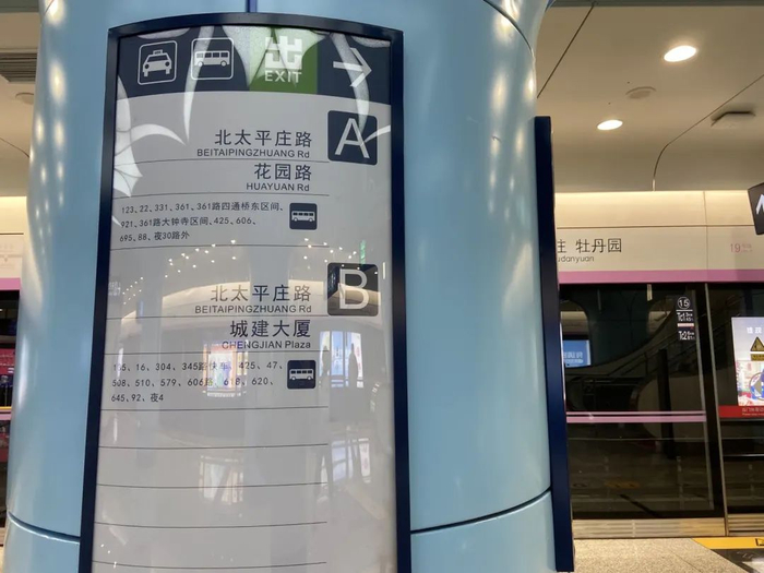 位于海淀区的北太平庄站共A、B两个进出站口。A口出站后临近北京融通远望楼宾馆,B口出站后临近城建大厦。