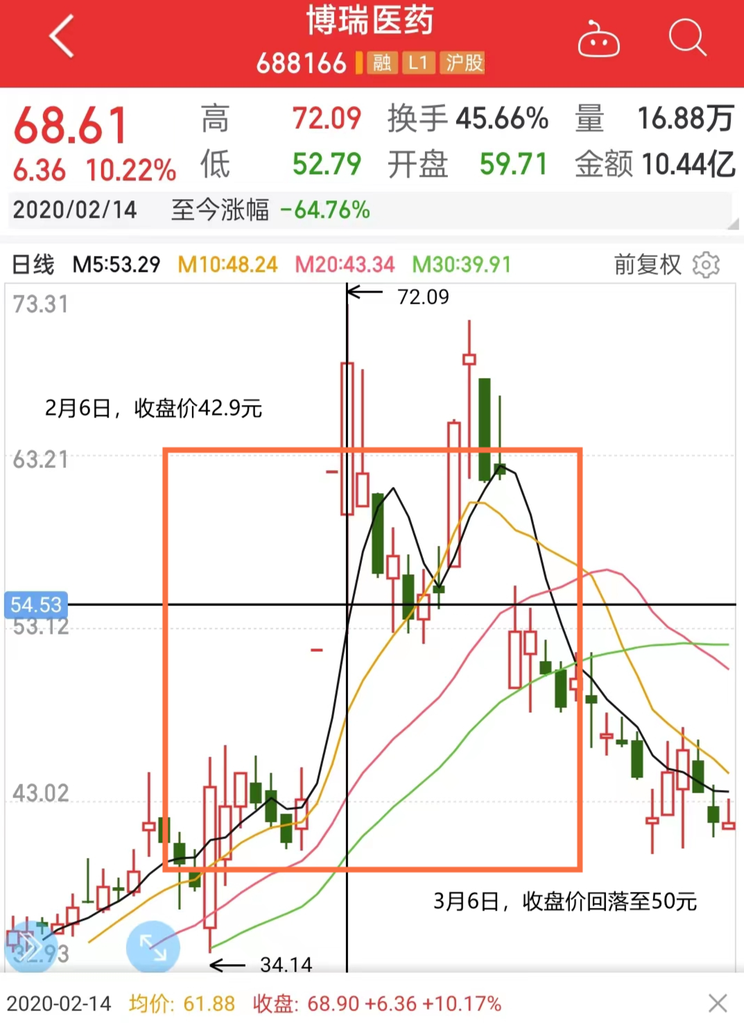随着监管层的警示、通报,博瑞医药的股价也快速回落,2020年3月6日已回落至50元/股;3月23日,进一步跌至38元/股左右。
