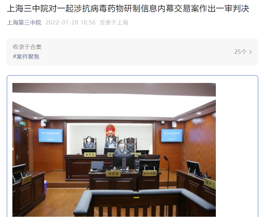 7月28日,上海市第三中院公开开庭审理并当庭宣判了被告人邢某涉嫌犯内幕交易罪一案,以内幕交易罪判处被告人邢某有期徒刑5年,并处罚金100万元。