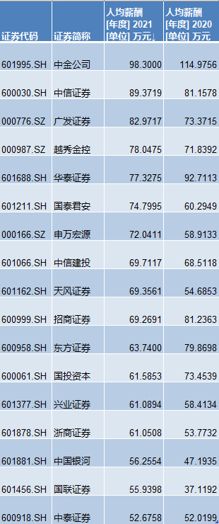 Wind数据显示,2021年中金公司以98.30万元的人均薪酬水平排名第一。不过,该人均薪酬水平已较2020年114.98万元有所下滑。