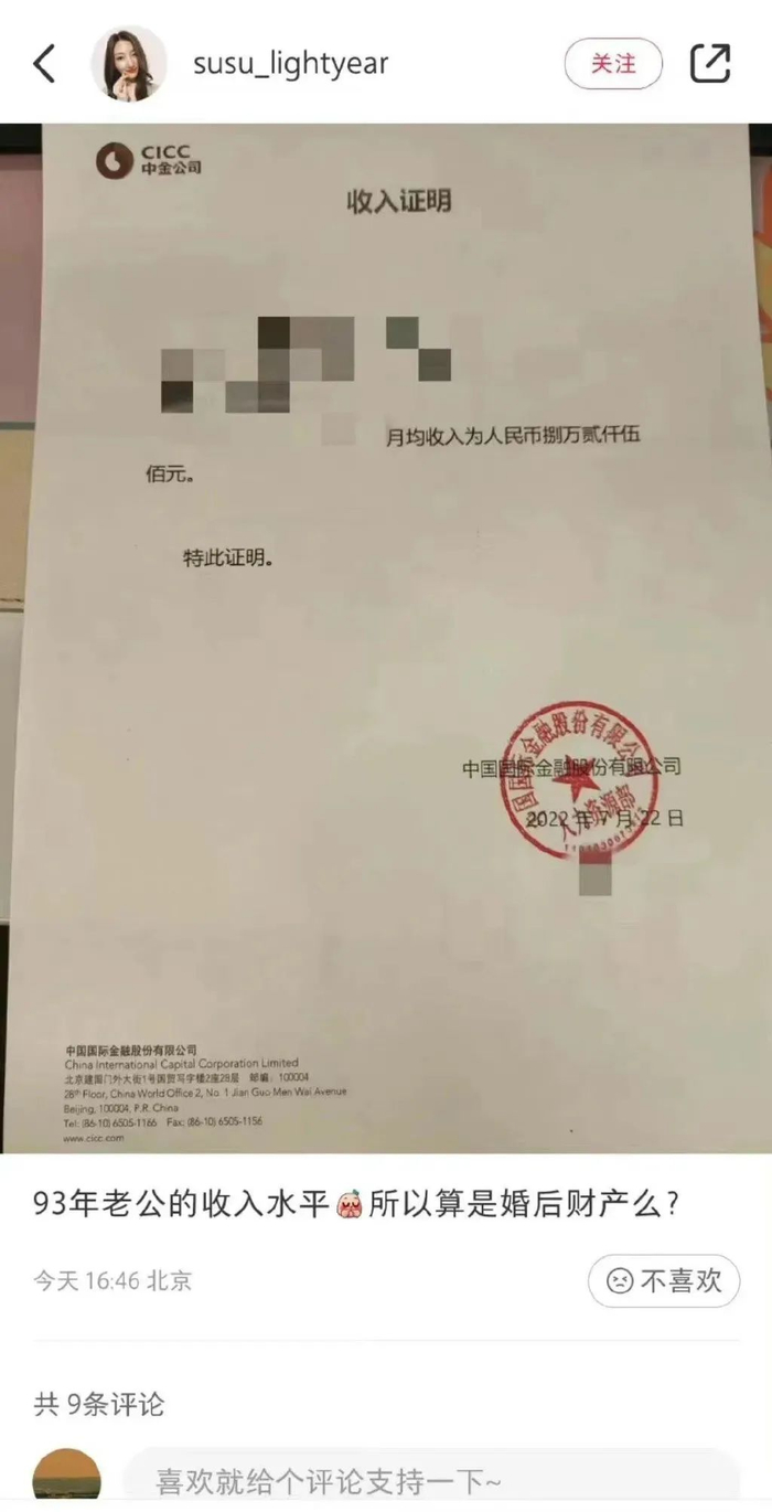 回到事件本身,7月28日,网上流传出,中金公司一名交易员的配偶晒出的其丈夫的收入证明。印有中金公司公章的证明材料显示,该交易员的月均收入为8.25万元。图片配文称:“93年老公的收入水平,所以算婚后财产吗?”