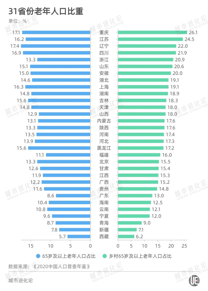 在全国31个省份中,有7个省份乡村65岁以上老年人占比超过20%,且集中分布在华东和川渝地区。作为外出务工大省,川渝地区农民工一直是沿海发达地区劳动力的重要来源。数据显示,即便在疫情影响下,2020年前5个月四川转移输出农民工达2378.1万人,居全国第一。