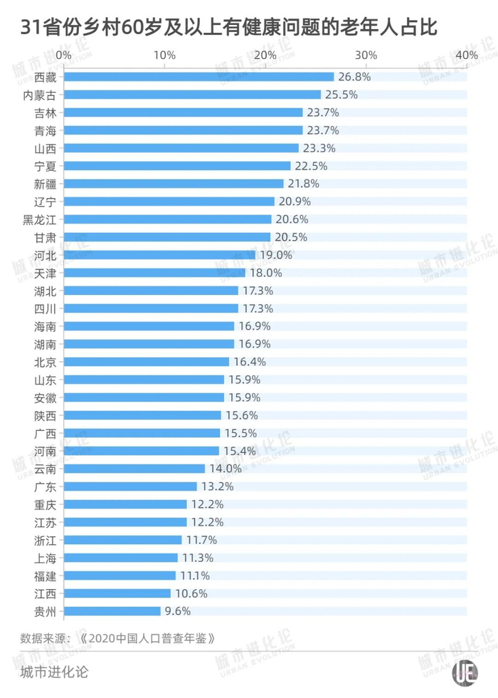 尽管过去农村老年人口超过城镇(包括城市、镇)老年人口的“倒置”现象在2020年七人普实现扭转——城镇60岁及以上人口比乡村同年龄段人口多了30万人;但进一步测算占总人口比重,农村老龄化程度仍远高于城镇:城市、镇60岁及以上老年人占比分别为15.6%和16.4%,而乡村这一比例则达到23.8%。