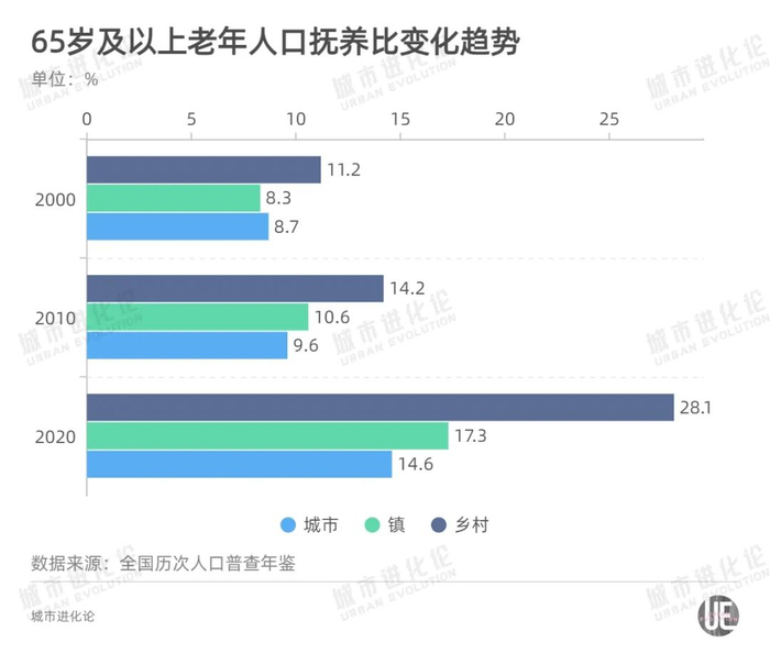 更高的抚养比,令农村老年人很难纯粹依靠子女实现养老。2020年,全国65岁及以上老年人口抚养比(指每100名劳动年龄人口要负担多少名老年人)为19.7%,其中城市这一比例为14.6%,镇为17.3%,乡村则高达28.1%。值得注意的是,与2010年相比,该数据在2020年几乎翻倍。