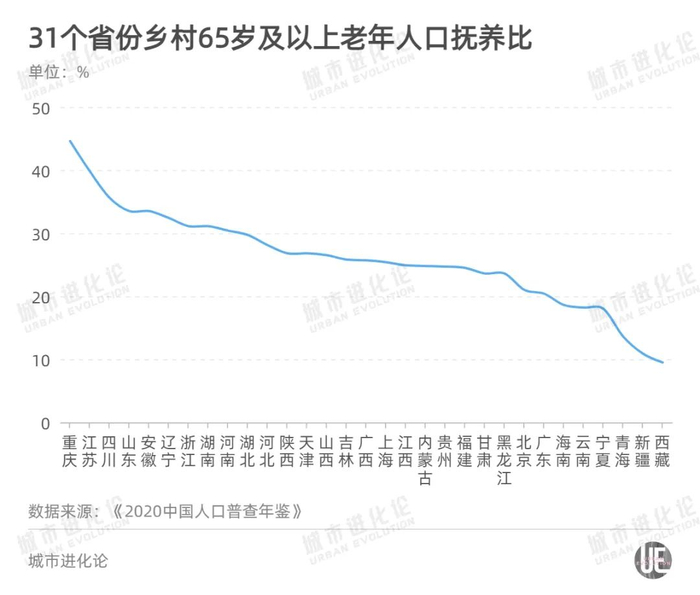 老年人口占比较高的省份,同样也是抚养比偏高的省份。其中,重庆乡村老年人口抚养比高达44.6%,江苏、四川居于其后,该比例分别为39.8%和35.6%。