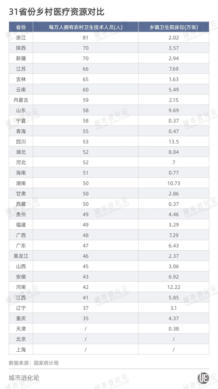 从各省份乡镇医院床位数来看,四川以13.5万张居于全国首位,河南、湖南紧随其后,分别为12.2万张和10.7万张,总体呈现东多西少的局面;而从每万人拥有农村卫生技术人员数来看,浙江、山西、新疆分别以81人、70人、70人位居前三,而末三位江西、辽宁、重庆则仅有41人、37人、35人人,差距悬殊。
