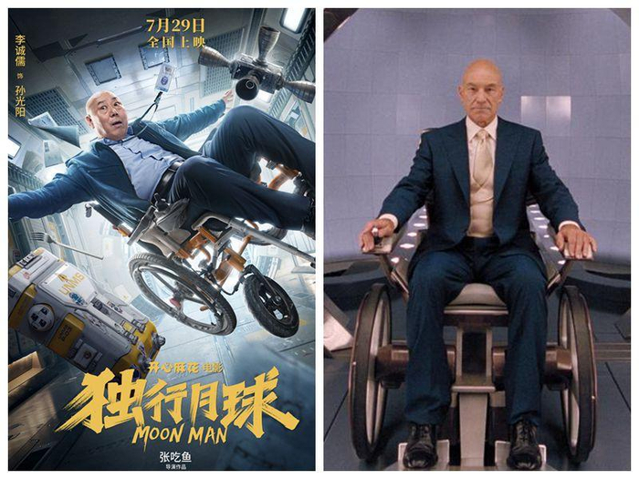 李成儒在《独行月球》中的扮相与《X战警》系列中的X教授造型对比。