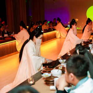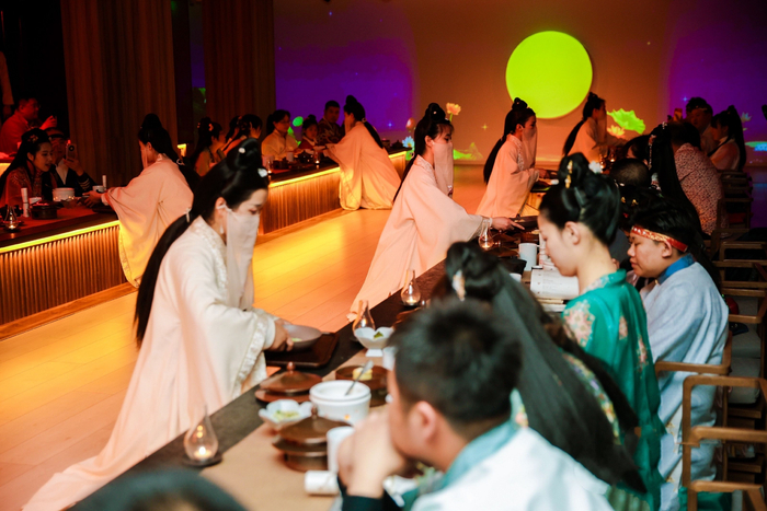 走进宫宴餐厅,仿佛瞬间“穿越”回了古代,在这里不仅可以体验富有仪式感的宫廷美食,还能欣赏演出、参观沉浸式光影展。“店里还有妆造司,吃饭前和女儿一起换上了汉服,太有氛围感了。”孙女士说。