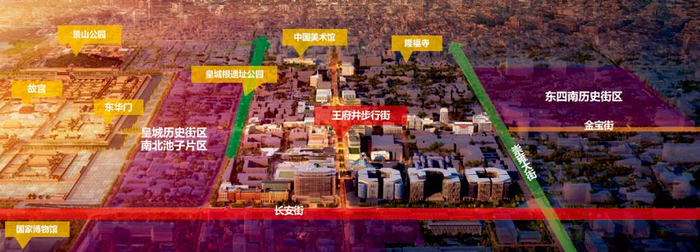 王府井商业区位于东城区长安街与中轴线交汇处,南起东长安街,北至五四大街、东四西大街,东起东单北大街、东四南大街,西至南河沿大街、北河沿大街,总占地面积166公顷,总建筑面积396万平方米。该地区历史底蕴深厚、文化资源丰富,王府井步行街是全国示范步行街,也是享誉中外的首都商业金名片。2017年以来,王府井立足全国文化中心和国际消费中心城市建设,发挥文化底蕴优势,积极探索传统商圈转型升级的模式和路径,不断推动业态升级、提升环境品质、释放“王府井”文化IP价值,塑造独具人文魅力的国际一流步行商业街区。