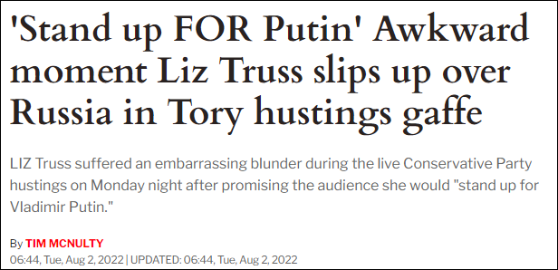 在周一晚竞选活动中,特拉斯不小心称她将“继续支持弗拉基米尔(普京)”。尽管意识到口误的特拉斯随即赶紧改口,并声称她“现在对俄罗斯实施了最严厉的制裁”,但她的这一失误还是被现场观众与英媒发现。英国《每日快报》直言,这是“一个尴尬的错误(an embarrassing blunder)”。