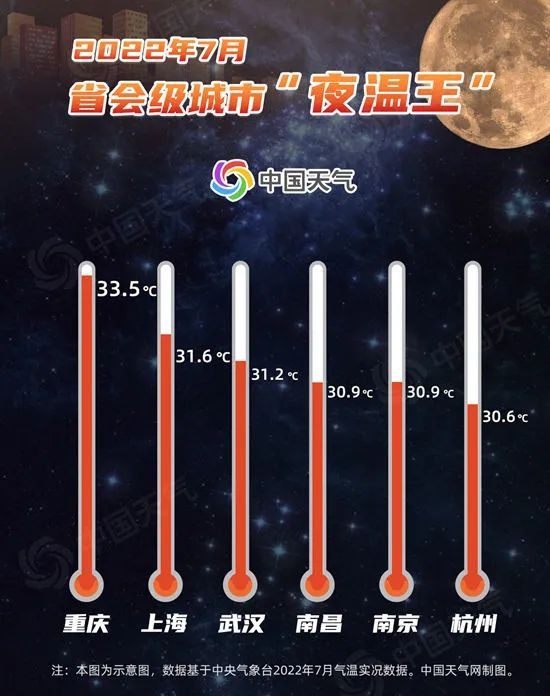 不仅白天热,晚上也是暑热不退,7月最低气温最高的6个省会级城市均超过了30℃,体验全天候炎热。最热的仍然是重庆,7月13日至15日连续三天打破当地夜温纪录,15日凌晨最低气温仍有33.5℃,“夜温王”当之无愧。