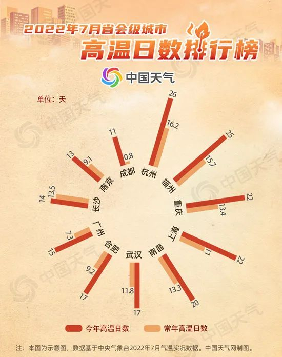 省会级城市中,杭州今年7月高温日数达到26天,高居榜首;福州25天紧随其后,而且是25天高温连续出现,一热几乎一整月。上海(徐家汇站)、重庆(沙坪坝站)高温日数也达到20天以上。