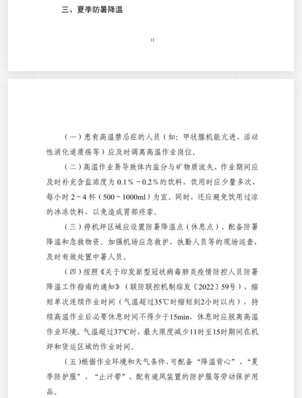 此外,民航局在《运输机场疫情防控技术指南》中,还特别提到了“夏季防暑降温”。要求停机坪区域应设置防暑降温点(休息点),配备防暑降温和急救物资。加强机场应急救护,执勤人员等等现场巡查,及时有效处置中暑人员。