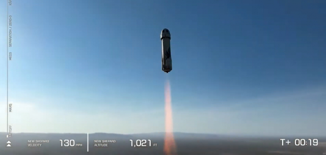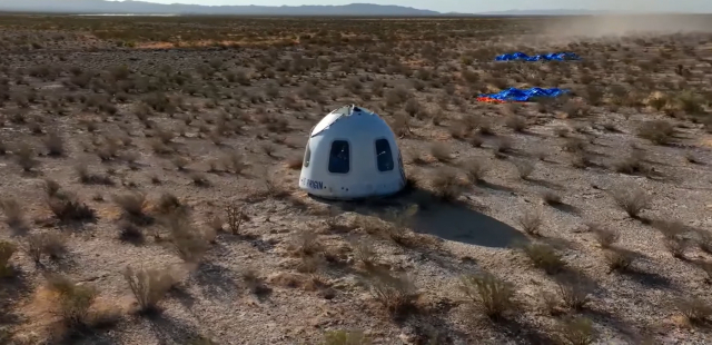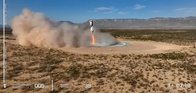 自动太空舱来到太空后,让乘客体验了几分钟的失重状态,之后在沙漠中降落。助推器也成功返回着陆。