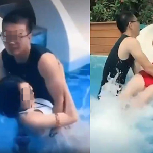 但若是男士或年龄稍大体型稍胖的女子冲下来,他要么单手托头部,要么侧身躲过。只见他们一下子就沉到浅池底,被呛水之后表情狼狈,这名男子慢慢将其拉起来,并保持一定距离。