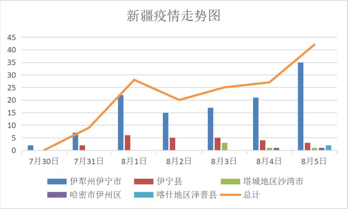 新疆本轮疫情是从7月底开始的。7月30日,新疆维吾尔自治区报告新增无症状感染者2例,在伊犁州伊宁市。8月1日,伊宁市新增感染人数为7例,伊宁县也报告了2例感染。8月3日,尼勒克县也报告了3例新增感染,4日,塔城地区沙湾时也报告了1例新增感染,5日,疫情蔓延至哈密市伊州区和喀什地区泽普县。