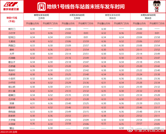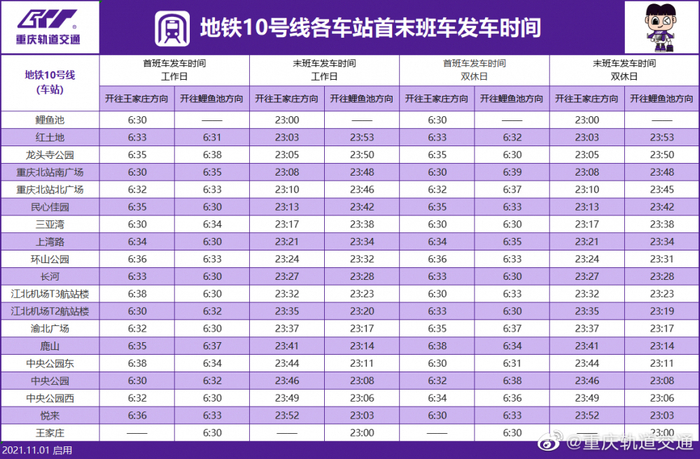 重庆轨道交通各线路最新运营时刻表来啦 新增江跳线运营时间