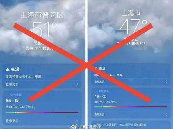 同样特别热的上海,最近有“普陀区51℃”的手机自带天气软件截图在网上传播,令网友震惊……“是真的吗?”