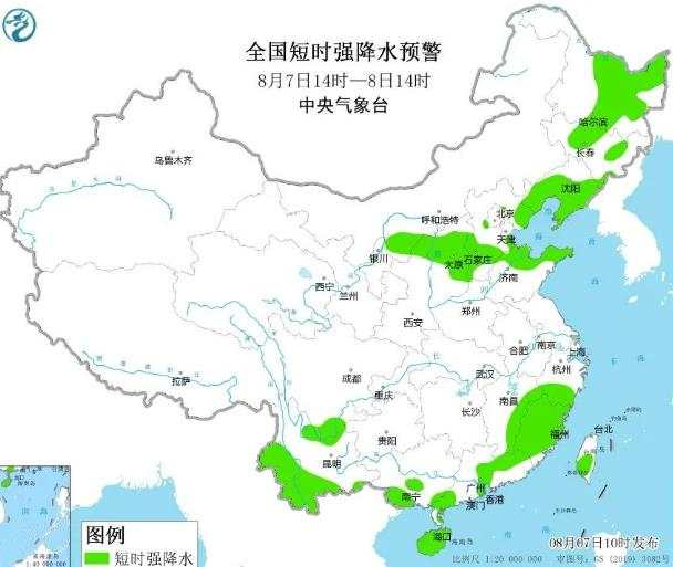 预计8月7日14时至8日14时,黑龙江中部偏南地区、吉林中部偏北地区、辽宁东部和西南部、陕西北部、山西东部、河北西部和东北部、山东东北部、浙江南部、福建北部、广西南部、海南岛等地的部分地区将有8-10级雷暴大风或冰雹天气;
