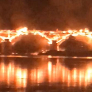 整座万安桥被火焰裹挟,滚滚浓烟中,不停地发出“噼里啪啦”的声音,烧成半截的木头带着火星,持续向水中掉落。
