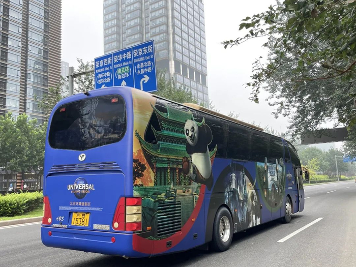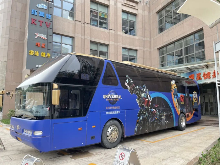 在北京兴基铂尔曼酒店停车场,一辆通身布满“小黄人““功夫熊猫”“侏罗纪公园”“变形金刚”等主题元素的北京环球度假区IP直通车(以下简称IP直通车)蓄势待发。