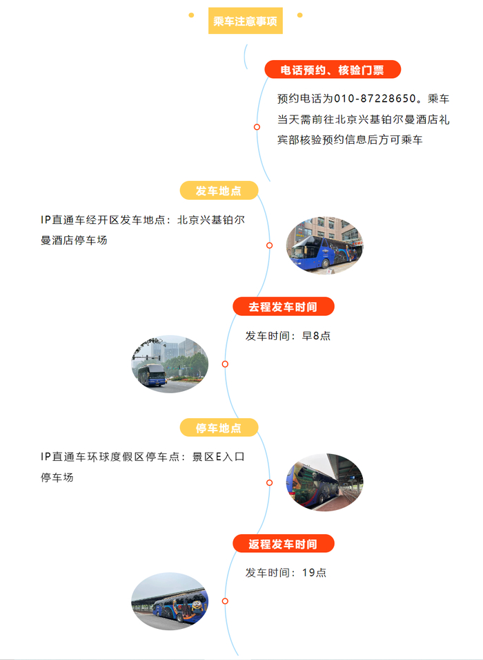 通过二维码及其他渠道购票、持有年票的游客购票成功后凭票均可预约乘车,预约电话为010-87228650。乘车当天需前往北京兴基铂尔曼酒店礼宾部核验预约信息后方可乘车。每天限定预约人数40人。将优先为通过二维码购票的辖区职工和居民群众提供预约服务。