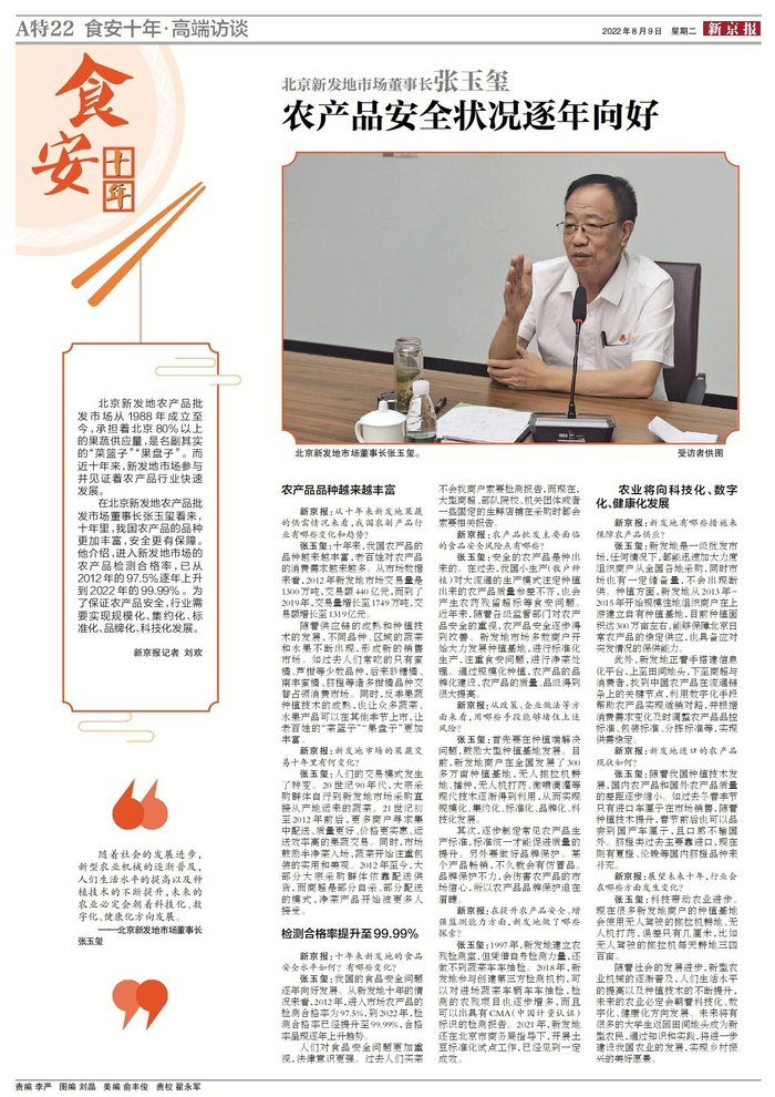 在北京新发地农产品批发市场董事长张玉玺看来,十年里,我国农产品的品种更加丰富,安全更有保障。他介绍,进入新发地市场的农产品检测合格率,已从2012年的97.5%逐年上升到2022年的99.99%。为了保证农产品安全,行业需要实现规模化、集约化、标准化、品牌化、科技化发展。
