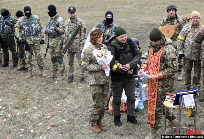 ↑3月份,乌克兰领土防卫部队里举行的婚礼仪式