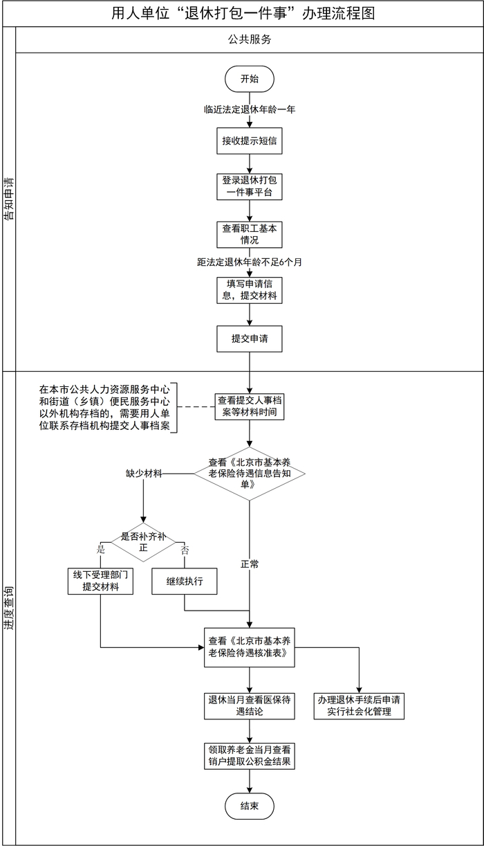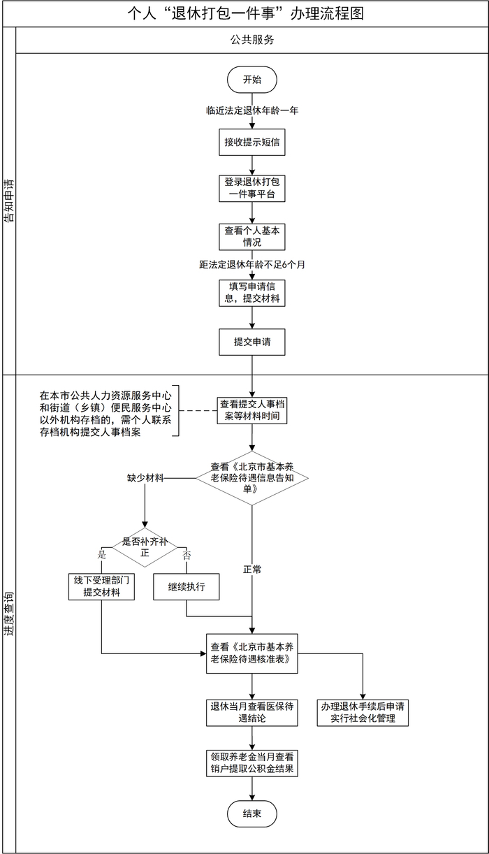 信息确认环节:提交人事档案等材料的10个工作日后,参保单位和个人可登录“退休打包一件事平台”在线查询,并下载《北京市基本养老保险待遇信息告知单》,人事档案存放在外地的,参保单位和参保人关注“申请进度查询”栏即可。