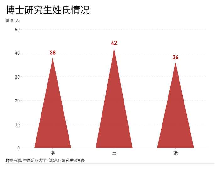 博士研究生姓氏统计情况如图。博士研究生的姓氏中,王、李、张最多,紧随其后的是刘(29)、孙(19)、赵(14)、杨(11)。