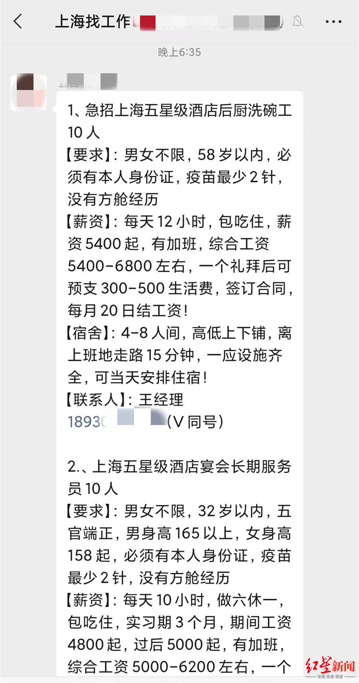 红星新闻记者随后加入了劳务中介招工的微信群,以求职者身份向“闫孟人力”询问是否招新冠肺炎康复者,中介人员表明,这种情况“不行”。“尚甸人力”则表示,新冠肺炎康复者求职时需要提供转阴时间等信息,招聘与否由厂里定夺。