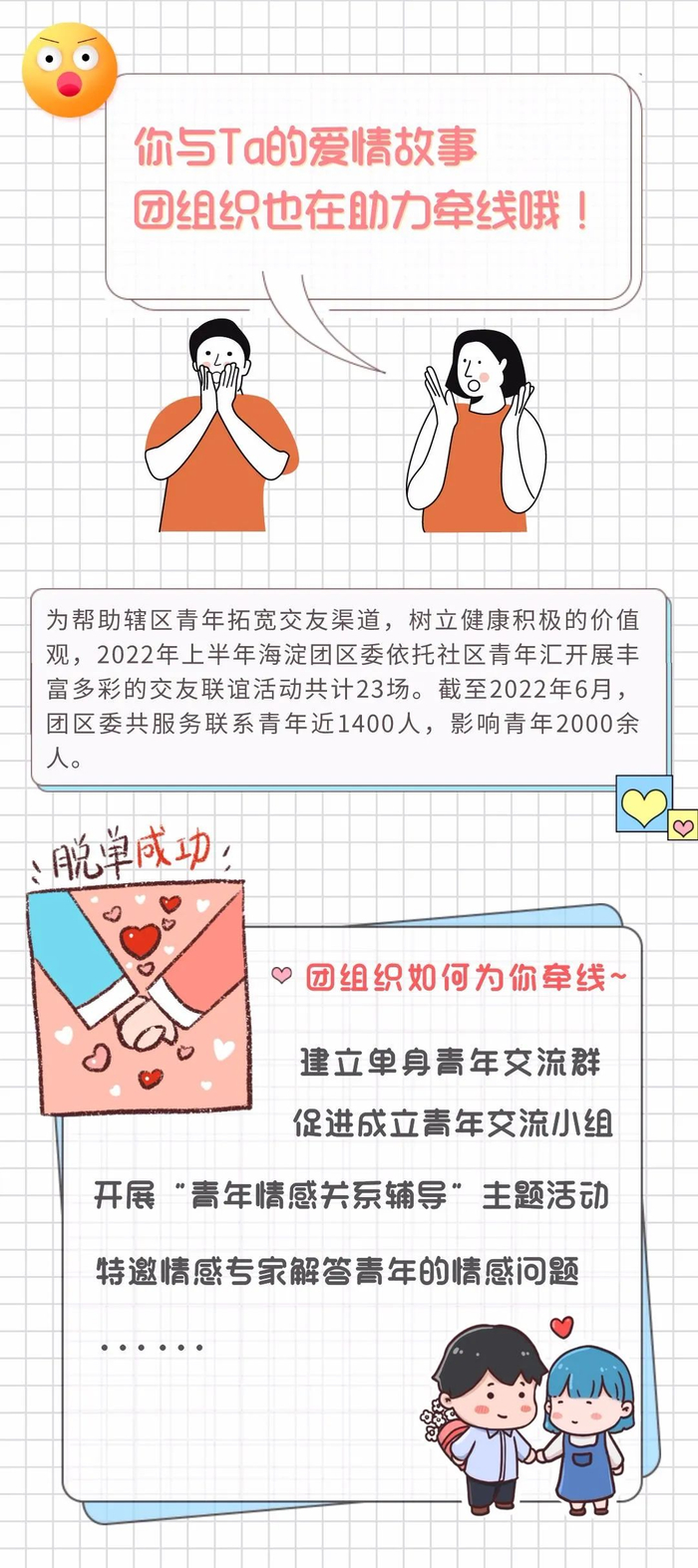 为帮助海淀辖区青年拓宽交友渠道,树立健康积极的价值观,海淀多部门也在积极作为。其中,2022年上半年海淀团区委依托社区青年汇开展了丰富多彩的交友联谊活动共计23场。包括建立单身青年交流群,促进成立青年交流小组,不定期组织小组活动,带动青年人在业余时间走出家门,认识更多的异性朋友,丰富兴趣爱好,养成健康的生活方式;开展“青年情感关系辅导”主题线上活动,特邀请情感方面的专家老师通过案例分析、心理知识讲解以及个性化问题分析,帮助当下城市恋爱青年解决相处中遇到的问题或困惑,提升对情感及婚恋方面客观理性的认识。