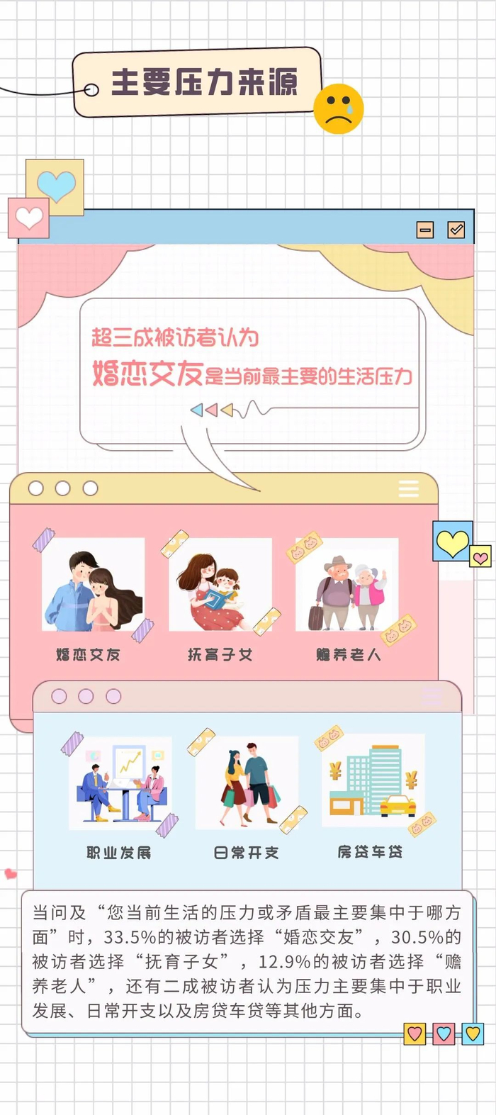 调研中,根据“您当前生活的压力或矛盾最主要集中于哪方面”调研数据显示,33.5%的被访者选择“婚恋交友”,30.5%的被访者选择“抚育子女”,12.9%的被访者选择“赡养老人”,还有二成被访者认为压力主要集中于职业发展、日常开支以及房贷车贷等其他方面。