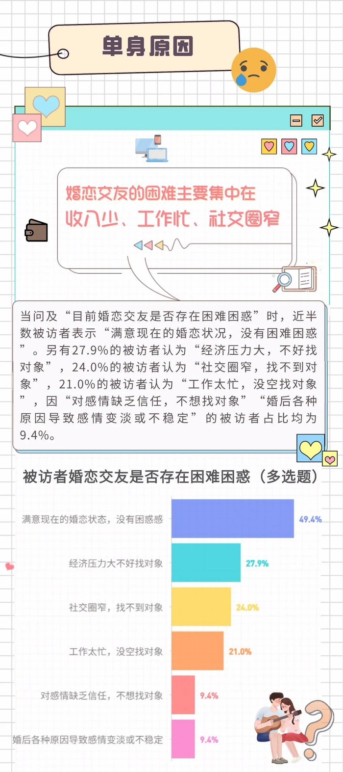 据悉,此次调研共收集到233份有效问卷,通过分析发现,青年婚恋交友的困难主要集中在收入少、工作忙、社交圈窄等。其中,27.9%的被访者认为“经济压力大,不好找对象”,24.0%的被访者认为“社交圈窄,找不到对象”,21.0%的被访者认为“工作太忙,没空找对象”,因“对感情缺乏信任,不想找对象”“婚后各种原因导致感情变淡或不稳定”的被访者占比均为9.4%。
