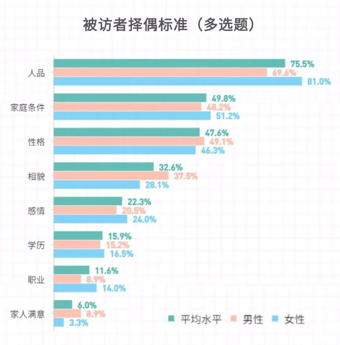 据调研结果显示,其中,75.5%的被访者看重“人品”,49.8%的被访者看重“家庭条件”,47.6%的被访者看重“性格”,选择“相貌”“感情”“学历”“职业”的被访者占比分别为32.6%、22.3%、15.9%、11.6%,6.0%的被访者择偶标准是“家人满意”。分性别看,在择偶时女青年比男青年更加看重“人品”“家庭条件”“感情”“职业”和“学历”因素,而男青年比女青年更关注“性格”“相貌”“家人满意”三项。