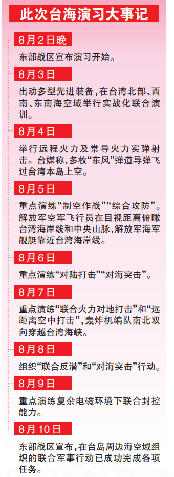 [环球时报报道 记者 郭媛丹 环球时报特约记者 晨阳]解放军东部战区新闻发言人施毅陆军大校10日表示,东部战区近期在台岛周边海空域组织诸军兵种部队系列联合军事行动,成功完成各项任务。震撼全球的这次解放军演习虽然已经落下帷幕,但外界普遍认为,它将对台海局势产生深远影响。