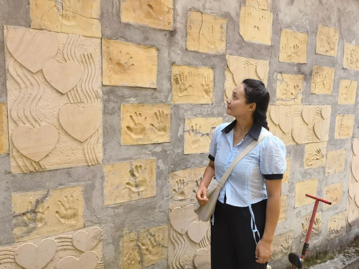 7月27日,霜晚秋正在看爱心桥桥头的“手印墙”。当年参与募捐修桥的媒体人和捐助者在这面留下了签名和手印。新京报记者 李照 摄