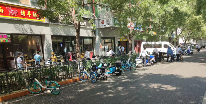 这条违停带中,电动自行车和共享单车大约各占一半。车辆之所以会聚集在这里,是因为道路北侧有很多底商,有些车就是工作人员的代步工具。记者看到,有身着工作服的工作人员从店里走出,骑上车扬长而去。违停带不时有新车加入,有人骑共享单车而来,看到路上停着其他共享单车,也把自己的车停了过去,然后走进了一家餐厅。