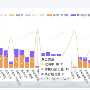 航班管家的最新数据显示,截至今日中午12点15分,海口美兰机场航班取消率92.11%,计划执行航班量15班,执行航班量仅6班。