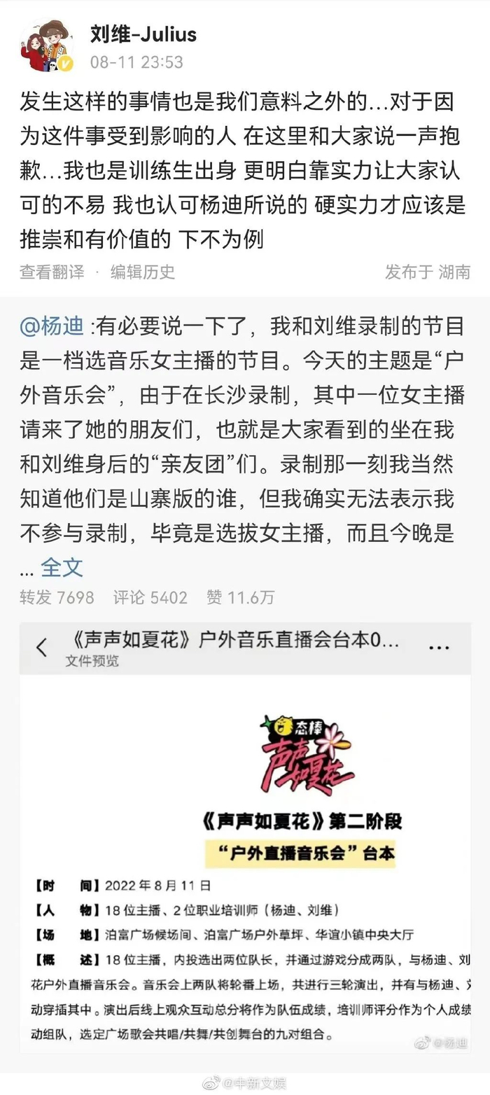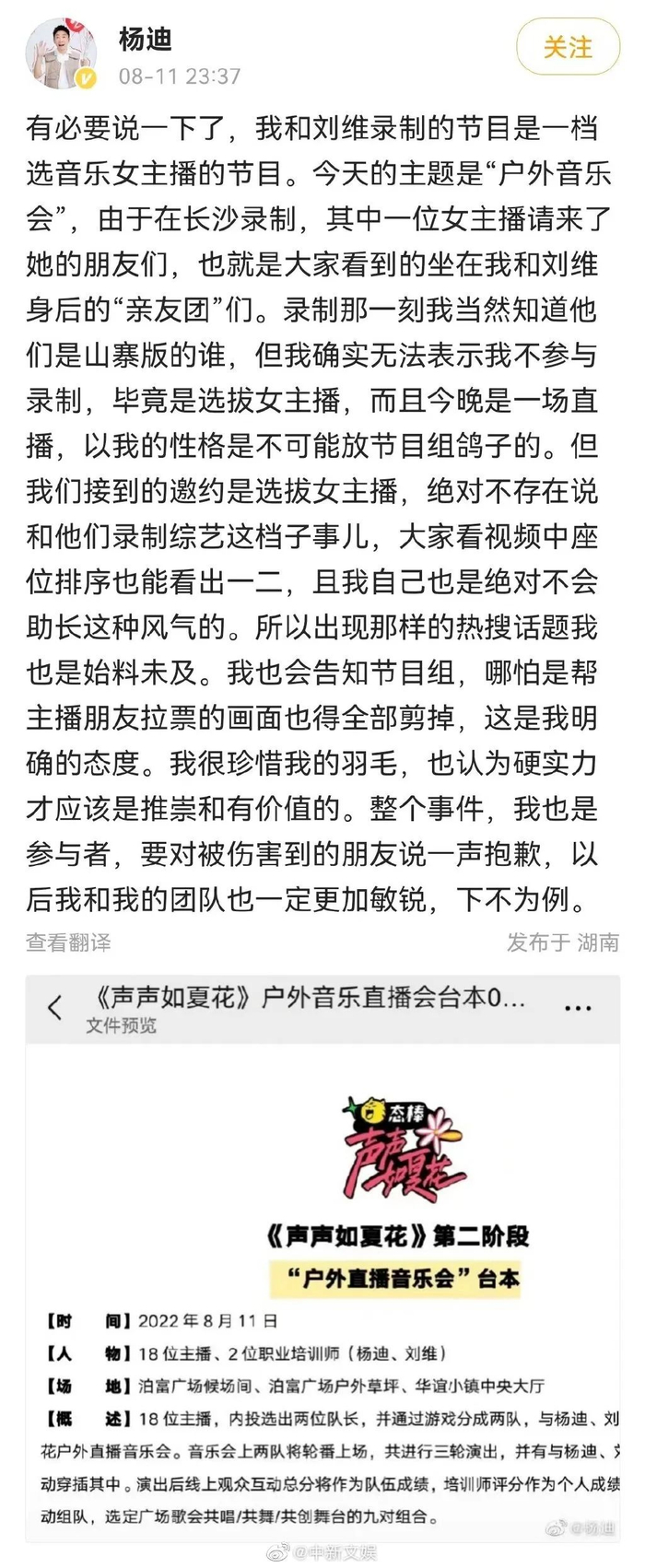 同时,杨迪晒出录制节目当天的台本,证明自己参加的是选音乐女主播的节目。