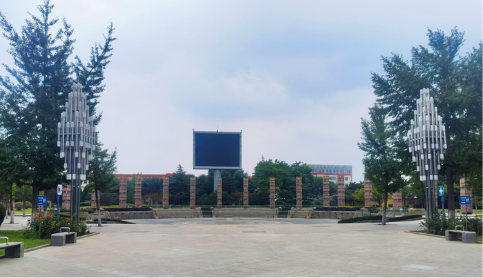 在西侧有一块儿大屏幕,能实时转播各类开幕式及比赛盛况、文艺演出等。屏幕与“S”“Y”主雕塑遥相呼应,一动一静的景观结合,使整个广场体现出文化的输出与传递。