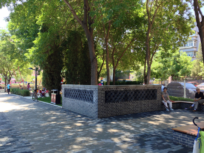 公园以青砖灰瓦为主题元素,以“城墙外,国槐下”为切入点,以仿古砖的“城墙灰”色为主基调色,以国槐为主基调树,利用“形”与“意”的结合,通过仿古砖的肌理和国槐相融合,展现出顺义区过去的“岁月痕迹”,体现顺义老城文化的主题思想。